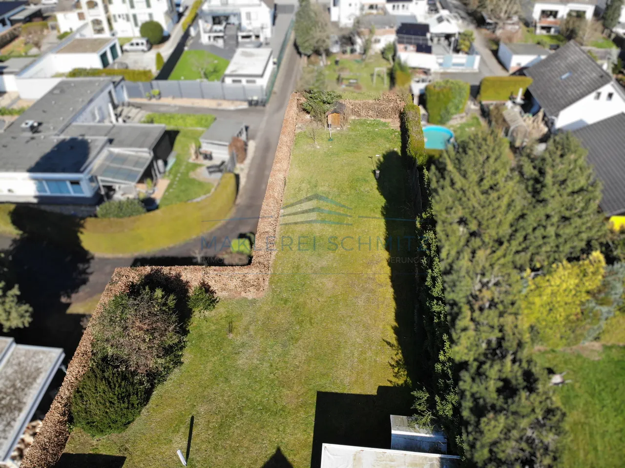 Aufgrund der Form des Grundstücks wären beispielsweise ein moderner L Bungalow oder ein schmaleres stylisches zweigeschossiges Haus wie in direkter Nachbarschaft denkbar.